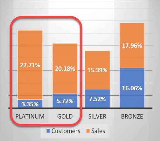 Top 9% of customers (Platinum and Gold combined) are producing 48% of sales. This holds true for most businesses customer base.