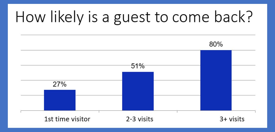 Only 1 in 4 first-time guests come back at all. But if you get a guest to visit 3+ times, you’ve got them for life. They’ll come back again and again.