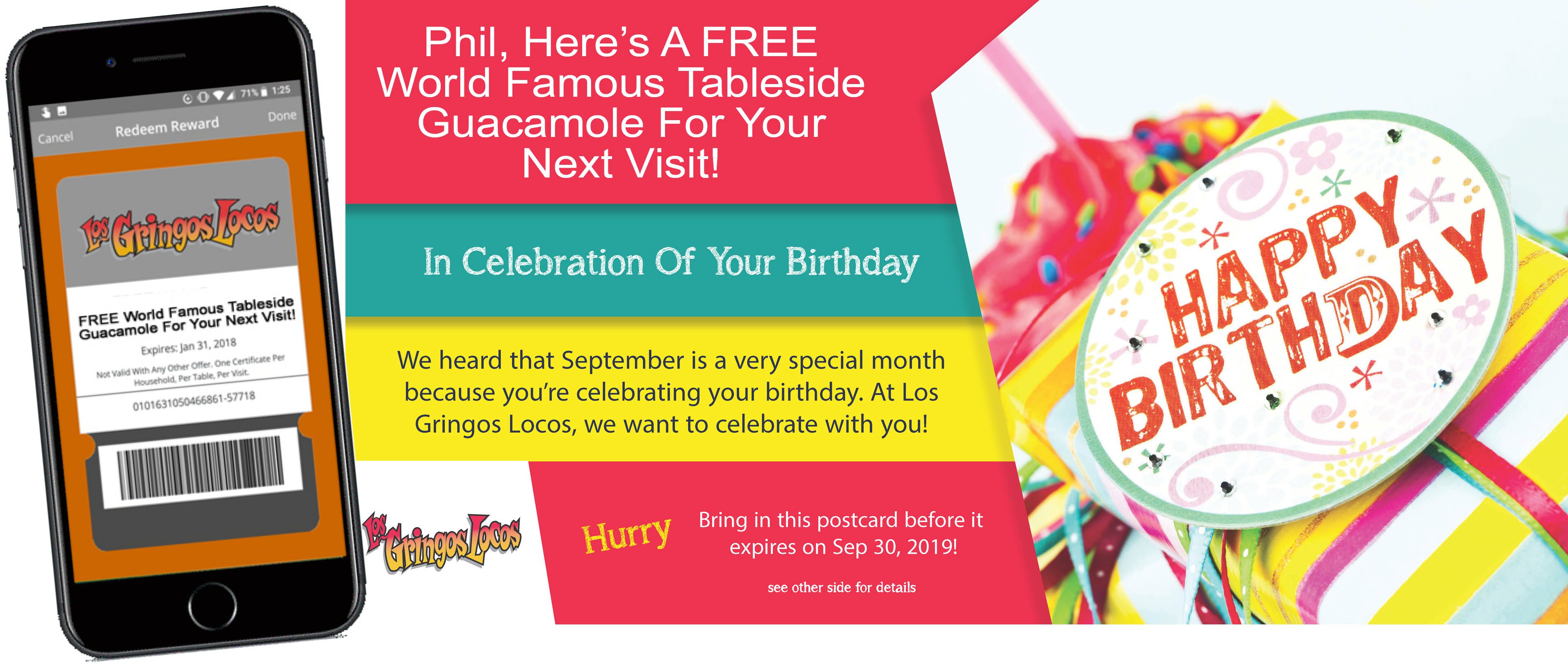 This isn’t just a simple birthday card. This is completely customized for your restaurant, and each one is personalized to your rewards member, giving them a special offer you have created. It’s over-sized and glossy, so there’s no way it will go unnoticed in someone’s mailbox. It’s also followed by an email and an App notification as well as a text message. The offer is valid for the entire month, so they can pick a day that’s best for them, and has a clear expiry date on it to remind them. Your customer won’t be able to resist coming in to celebrate their birthday with their friends in your restaurant...